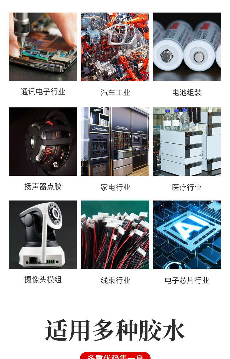 Underfill、手機、平板、數碼、汽車工業、電池組裝、揚聲器點膠、PC軟板、五金配件、芯片綁定、半導體封裝、LED組裝點膠、PCB點膠、半導體微電子組裝、攝像頭模組(Lens花瓣固定、VCM點膠等)