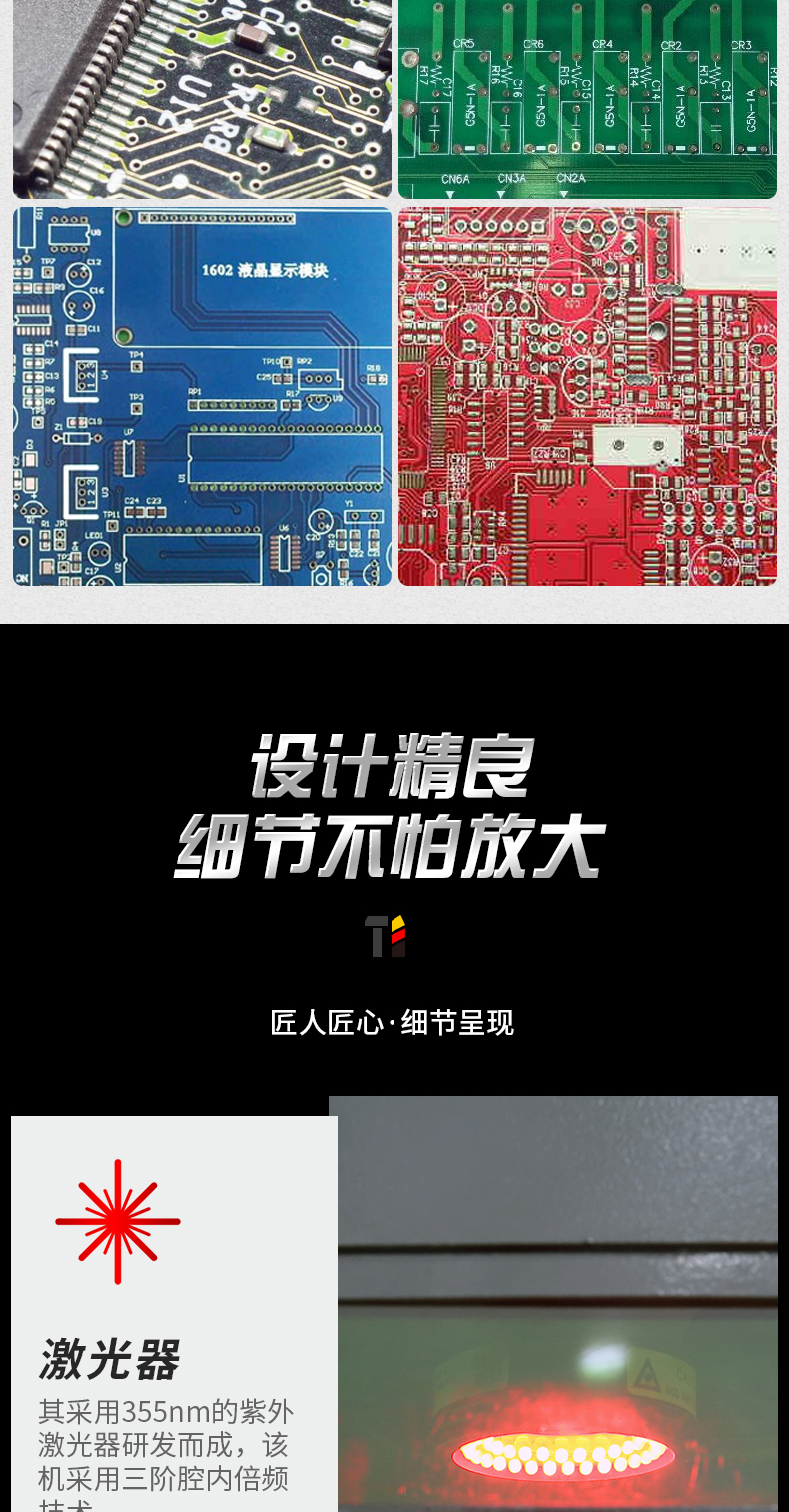 快速將拼板生產的PCB分割成獨立的電路板,加工LTCC,加工半固化片,在FR4上鉆孔、鉆微孔、激光直接成型電路圖形等。紫外激光與其他加工方式或其他激光相比,切割邊緣更整齊,外形尺寸精度更高。產品加工模式無間隙切換,只需點擊軟件菜單導入新加工項目即可。