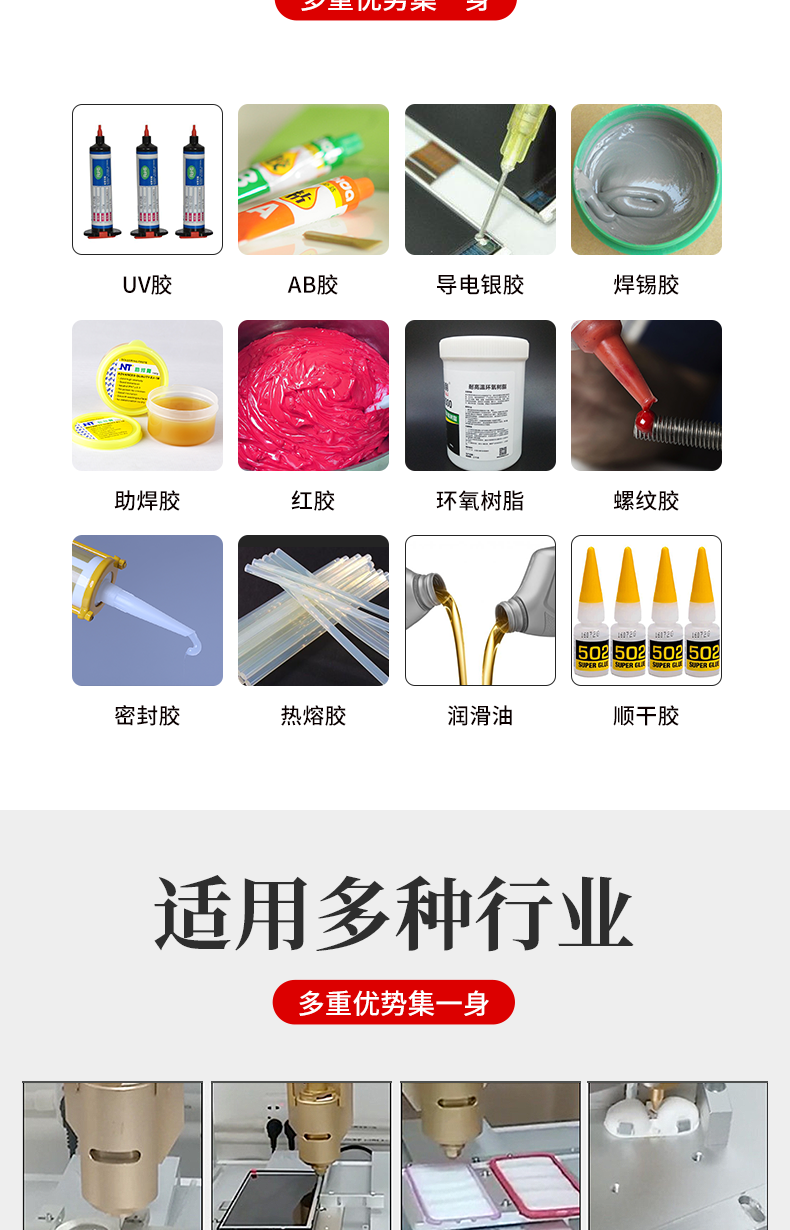 9. 適用于各式需求點膠產(chǎn)業(yè),如:一般常見的 UV 膠、硅膠、silicon、紅膠、COB 黑膠、導(dǎo)電膠、錫膏等點膠,皆可使用再 D 系列設(shè)備上。