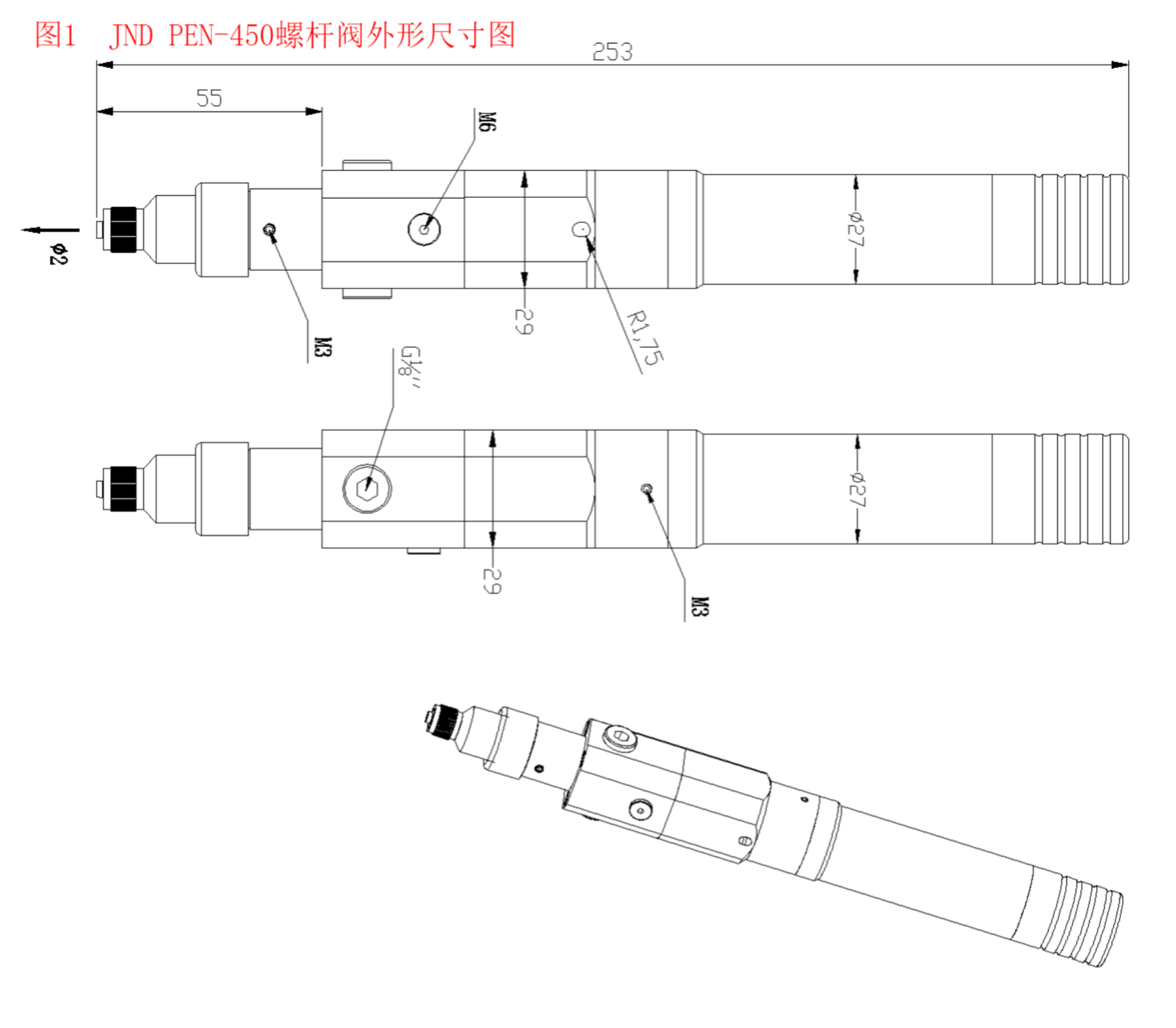 設備本體尺寸:①螺桿閥: 253(L)mm×33 (φ)mm(具體尺寸見圖1)
